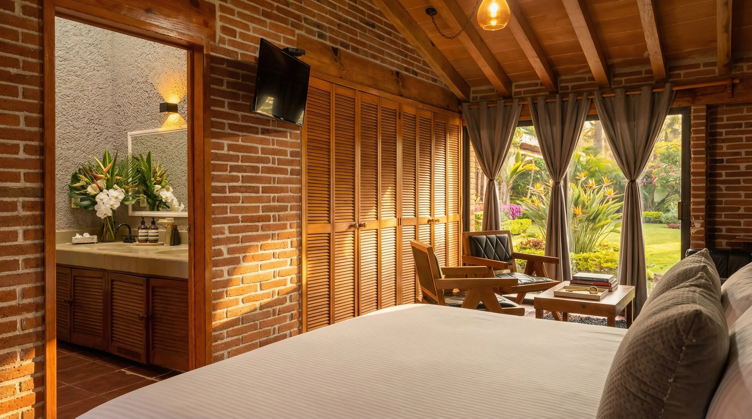 Cama King Size, terraza o jardín privado, room service, Smart TV, Wi-Fi de alta velocidad y caja fuerte. Dispone de baño privado con regadera, toallas y batas de baño, amenidades de aseo cuidadosamente seleccionadas, secadora de cabello, aire acondicionado y agua caliente. Incluye desayuno continental para comenzar el día sin prisas.